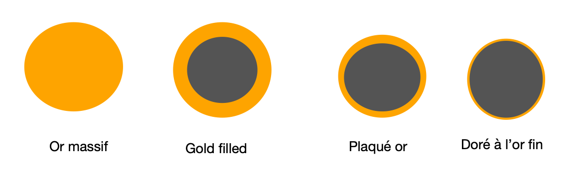 La principale différence est la quantité d’or qui va être utilisée. Dans le cas du gold filled, la quantité d’or doit représenter au moins 5% du poids total. Le métal précieux utilisé dans ce cas là peut être de différents carats et est généralement compris entre 9k et 18k. Pour le plaqué or, la concentration représente que 0,05% du poids total. En termes de carats, il n’est pas rare, voire fréquent, de trouver du plaqué or 24k. L’épaisseur du plaqué or correspond à environ 3 microns (0,003 millimètre). La qualité globale des bijoux est donc différente entre le gold filled et le plaqué or.